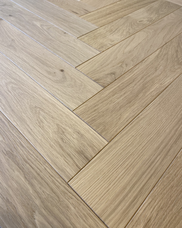 Parchet stratificat stejar Herringbone dimensiune 14x125x600 mm, cu substrat de placaj multistrat,strat de uzură 3mm,bizotat,nefinisat.